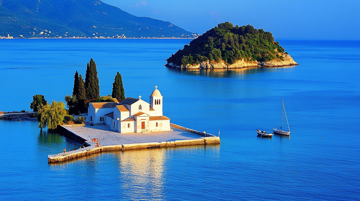 One of Corfu’s most photographed spots, Kanoni offers a breathtaking viewpoint of Vlacherna Monastery, a tiny whitewashed chapel sitting on a small islet connected by a narrow pier. Just beyond, the famous Mouse Island (Pontikonisi) emerges from the sea, adding to the charm of this postcard-perfect setting.