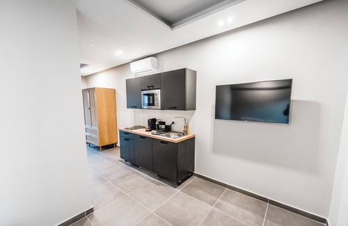 The holiday apartment Nima 3 with step-free interior in Corfu is the perfect accommodation for a stress-free holiday with your loved ones. The 34 m² property consists of a living room with a sofa bed for 2 people, a well-equipped kitchen, 1 bedroom and 1 bathroom and can therefore accommodate 4 people. Additional amenities include high-speed Wi-Fi (suitable for video calls) with a dedicated workspace for home office, a smart TV with streaming services, air conditioning as well as beach/pool towels. A baby cot is also available.