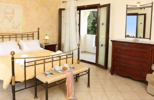 Exclusive Villa in Corfu with private pool and luxurious interiors with sea views in a quiet secluded location. The villa consists of 4 bedrooms (two on the 2nd floor and two on the ground floor), 4 bathrooms, a large living area with fireplace and fully equipped kitchen on the 1st floor. Designed for up to 8 people and ideal for couples or big families who want to spend holidays together. Facilities include: air conditioning, satellite TV, DVD player, fireplace, BBQ, outdoor dining area ,Jacuzzi in master bedroom, jacuzzi in private pool and children's pool with sun loungers in the garden.
