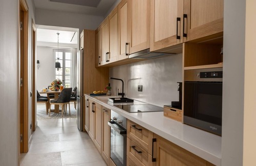 It is furnished and styled on superior hotel standards and is fully equipped, like a regular apartment. It has separate and commodious spaces, with many windows and a front balcony, which allow abundant natural light and rich views of the Ionian Sea, the Old Port, the main street and the New Fortress. It is spacious, with an excellent layout that includes two bedrooms (one with a king- size bed, the other with two twin beds), a living room with two sofas and an armchair,a dining table for six, a full kitchen set, and two bathrooms with shower.