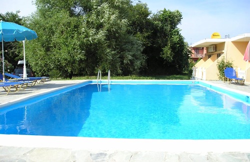 Self catering studio with one bedroom eqquiped with two beds. Shared pool available, parking and free wi fi. Room has ensuite bathroom and toilete, kitchenette and fridge with kitchenware & utensils and furnished balcony with garden/pool view. Beach is 200 meters away with shops and restaurant. Bus stop from/to corfu town is near. Super market and atm machine 100 meters distance. Walking distance to both resorts, Mesongi and Moraitika.