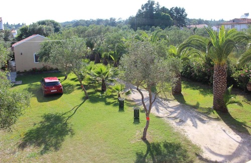 The IRINI holiday home complex is located in the south-east of the island, approx. 4.5 km from the charming village of Lefkimi and approx. 3 km south of the small harbour of Lefkimi, on a well-kept, huge garden plot with lawn, many Mediterranean flowers, plants and palm trees. The complex consists of 2 two-storey buildings, which are staggered one behind the other, and a single-storey building perpendicular to them. In the front building, which faces the sea, there are two adjoining studios on the ground floor. The flat on the upper floor is used as a holiday flat by the landlord couple. In the second row, directly behind the front building, there is another house with two flats on each floor. Approx. 60m perpendicular to the second house is another building with 3 adjoining holiday flats.