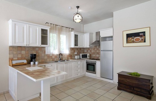 At guests' disposal: 3 bedrooms with air conditioned and en-suite bathroom, private swimming pool (heatable) (10 x 4,5 metres; min depth: 0,9 metres; max depth: 1,5 metres), outdoor dining area with table and chairs, barbecue, internet wi-fi, washing machine, beaches, shops and tavernas by the sea at a walking distance, parking